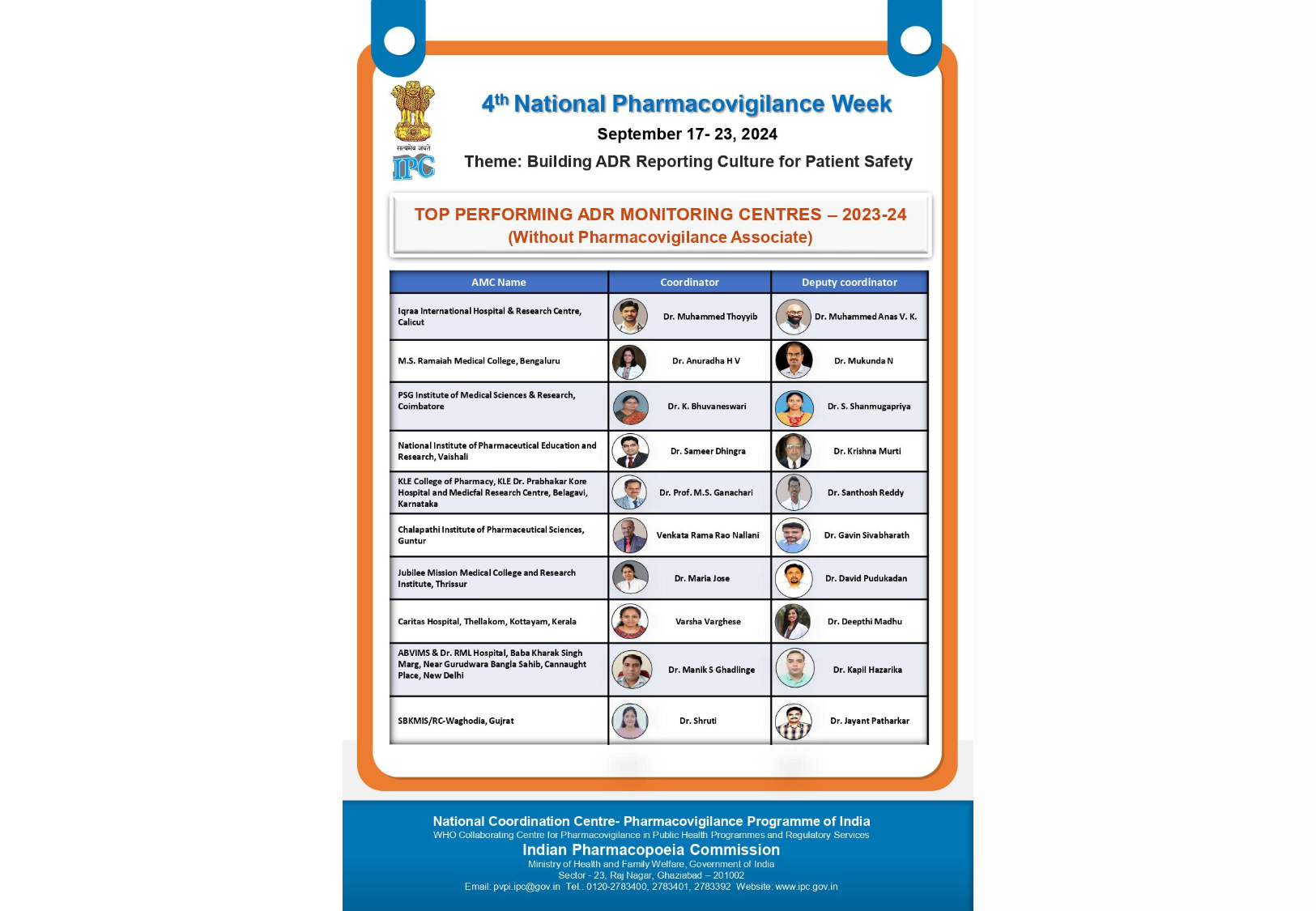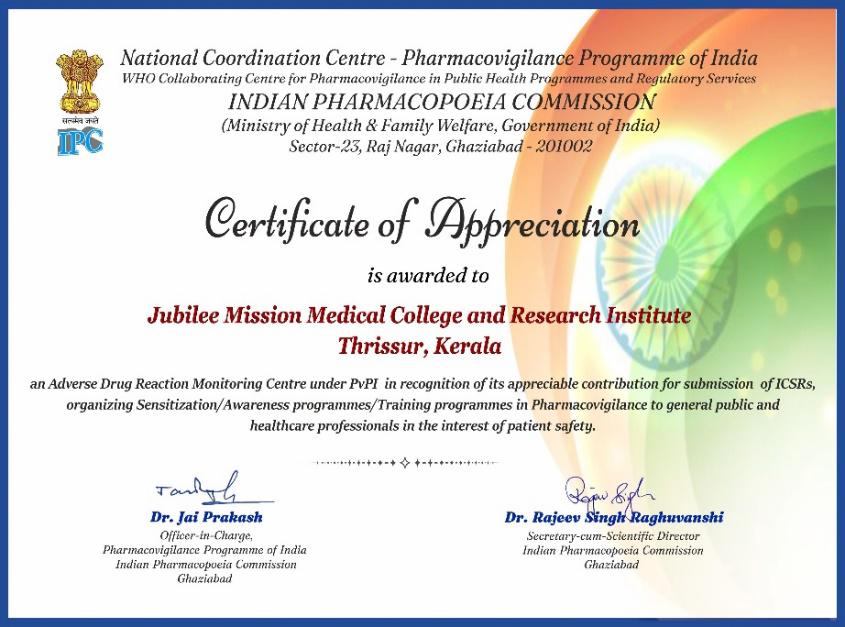 • Recognised as Top 4thADR monitoring centre in 5th National Pharmacovigilance week  2024-2025 under the Pharmacovigilance Program of India (Ministry of Health & Family Welfare, Government of India).